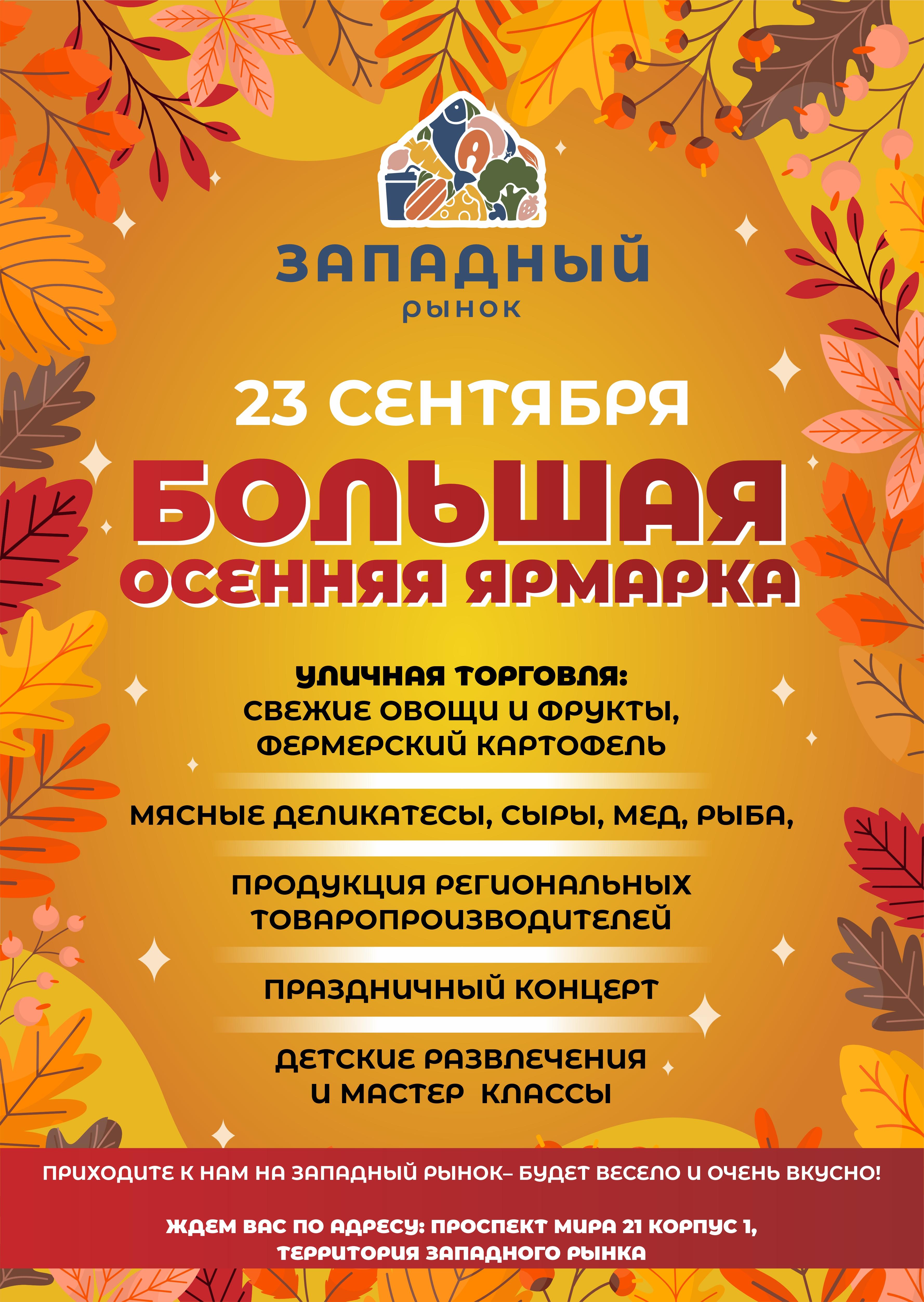Ярмарки 12.02.2024 В Великом Новгороде пройдут социальные ярмарки сельхозпродукции 🍅🥒 17.10.2023 21 октября Осенняя Ярмарка рынок "Западный". 17.10.2023 23 сентября на Западном рынке состоится большая осенняя ярмарка🍂🌽 29.03.2023 Западный Рынок 1 Апреля Открываем ярмарочный сезон! 13.10.2022 О межрегиональных ярмарках на территории города Москвы 10.10.2022 8 и 9 октября 2022 года на рынке «Западный» прошла Большая осенняя ярмарка 12.09.2022 10 сентября 2022 года на двух площадках города: территория рынка «Центральный» и рынка «Западный» прошли сельскохозяйственные ярмарки 05.09.2022 10 сентября на территории Западного рынка состоится агропромышленная ярмарка «Урожай 2022»! 07.07.2022 Об утверждении Порядка размещения объектов развозной торговли сельскохозяйственной продукцией на территории Великого Новгорода 07.07.2022 Об утверждении Перечня мест для осуществления развозной торговли сельскохозяйственной продукцией на территории Великого Новгорода 13.04.2022 30 апреля 2022 года на территории ТК «рынок Западный» состоится весенняя ярмарка . 27.08.2021 28 и 29 августа 2021 года с 9.00 до 16.00 на территории Центрального рынка по ул. Прусская, д. 15 будет проходить сельскохозяйственная ярмарка «Урожай - 2021» 19.09.2019 О мерах по оказанию содействия в проведении специализированной областной агропромышленной ярмарки "Урожай-2019" 11.04.2019 О мерах по оказанию содействия в проведении специализированной областной агропромышленной ярмарки "Сад- огород -2019" 13.09.2018 О мерах по оказанию содействия в проведении специализированной областной агропромышленной ярмарки "Урожай -2018" 20.04.2018 О мерах по оказанию содействия в проведении специализированной областной агропромышленной ярмарки "Сад- огород -2018" 26.02.2018 О проведении ярмарок 18.09.2017 О проведении специализированной областной агропромышленной ярмарки "Урожай -2017" 24.08.2017 О проведении ярмарки "Блошиный рынок на Прусской" 16.12.2016 Об организации предновогодней продажи елок « 1 2 3 4 »